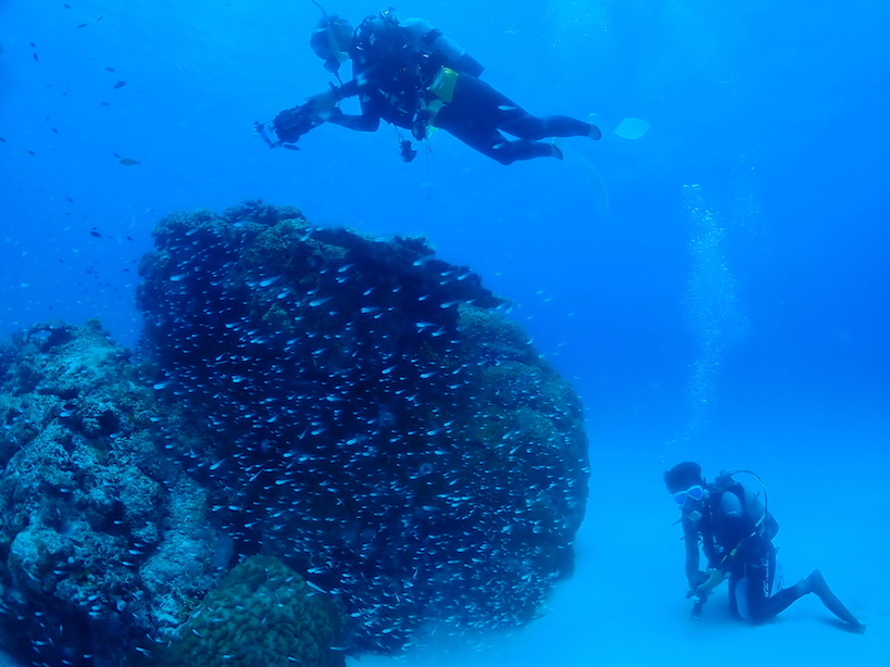 台風の合間のダイビングは、うねりの影響もあって、船酔いしたゲストもいましたが、